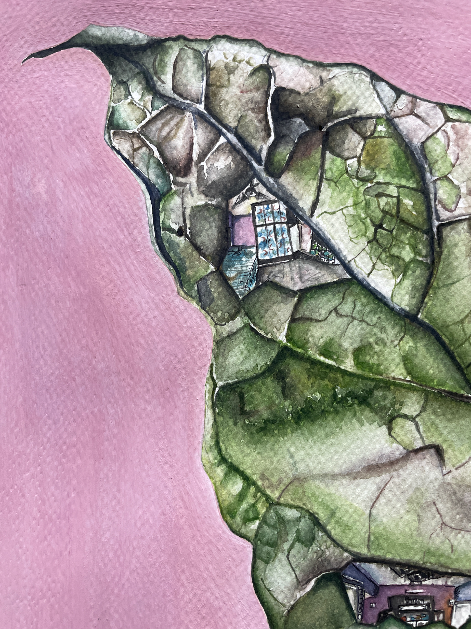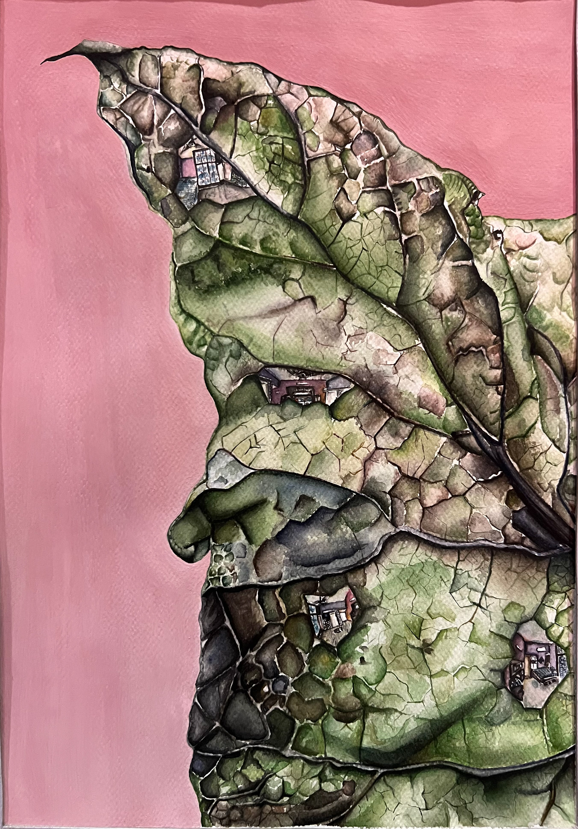 The artwork conveys the concept of life of nature through a leaf, but how their life goes unnoticed. Few pores of the leaf are painted as the four sides of my room that represents 'my' life, implying how limited it is for me.