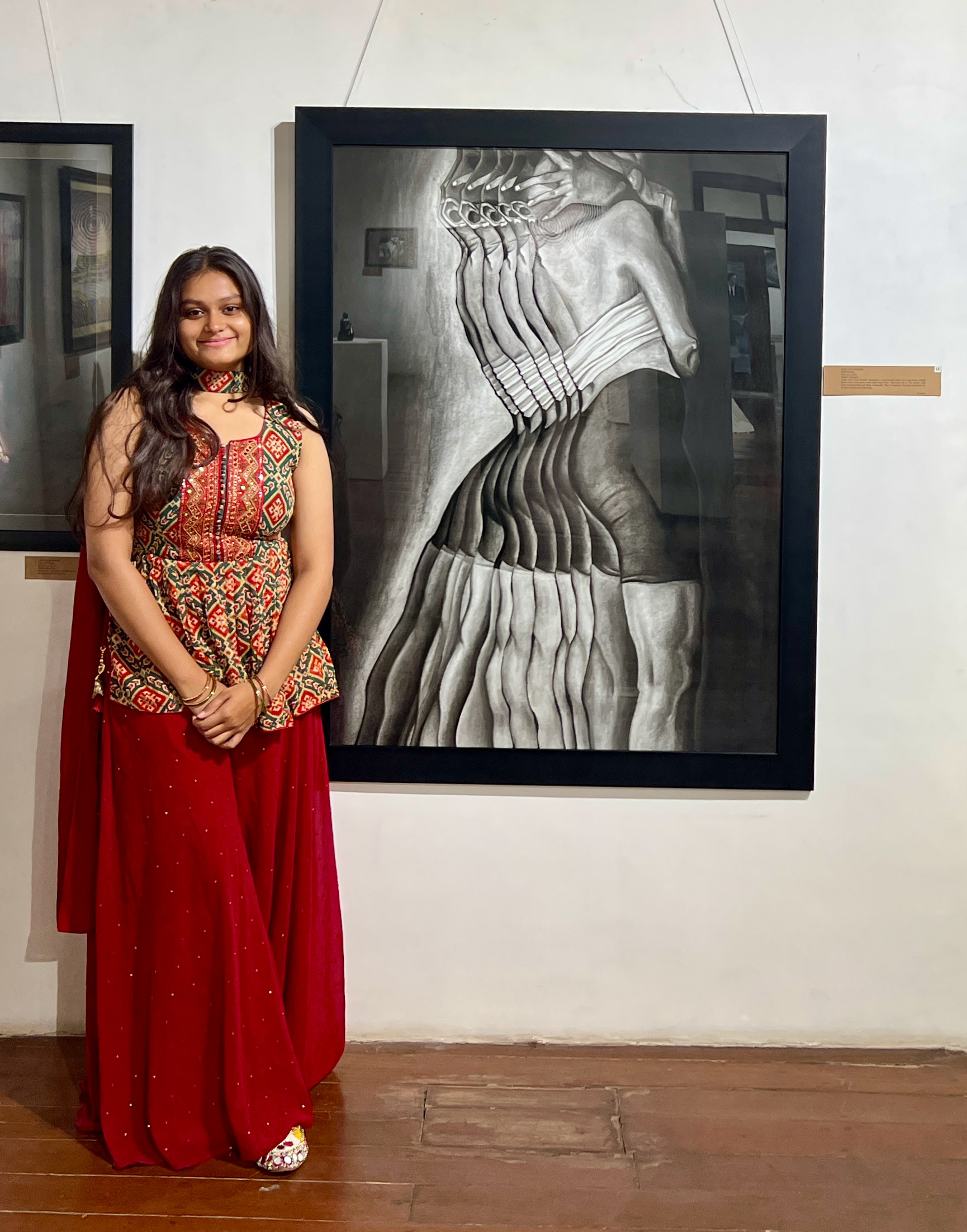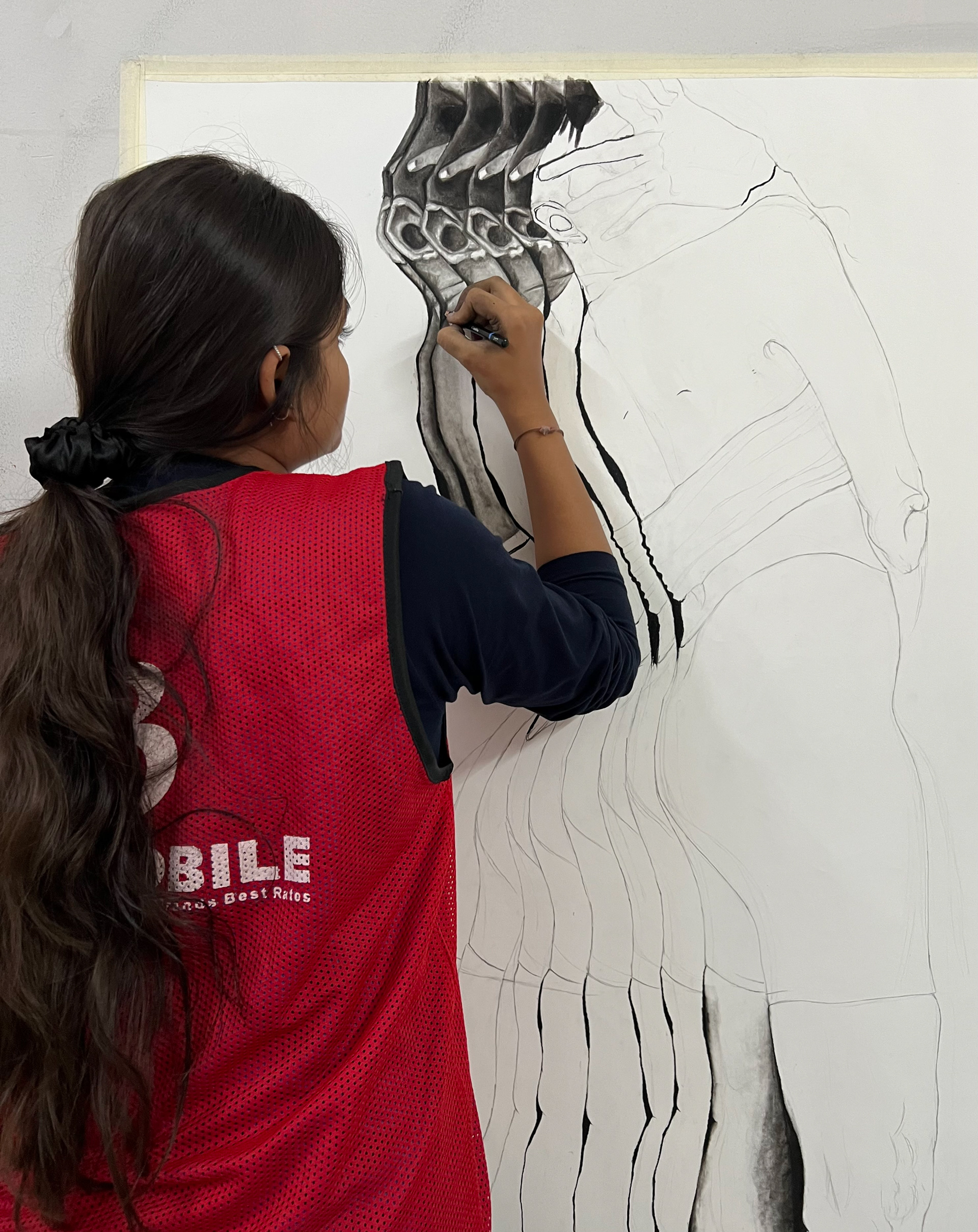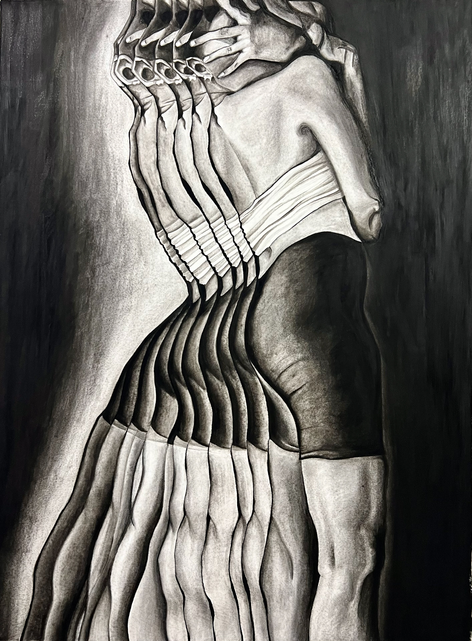 The artwork represents a connotation about the impression people leave when they move away from our lives. The mark left by the person with time becomes dull and fades eventually. This is depicted through symbolism by the flow of motion in the body.
