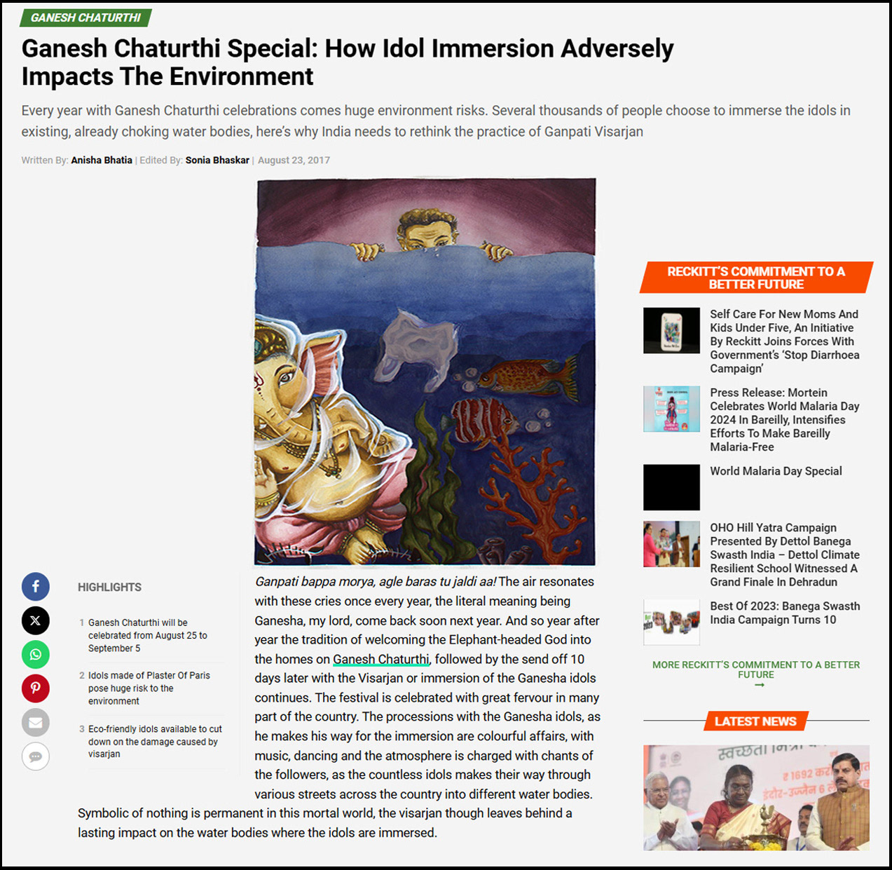 An editorial illustration based on the article highlighting the environmental impact of idol immersion during Ganesh Chaturthi, contrasting the festival’s vibrancy with the polluted waters it leaves behind.