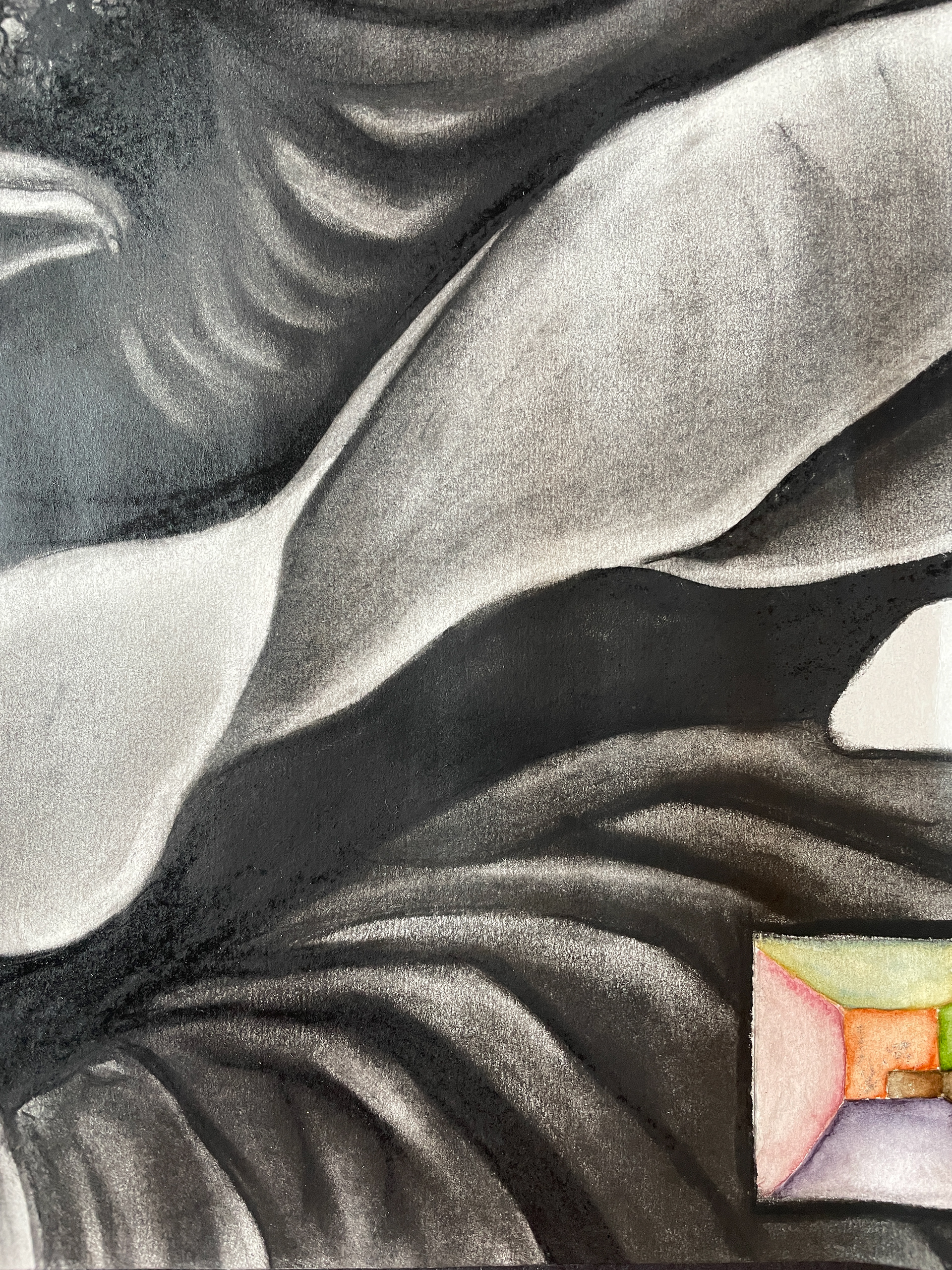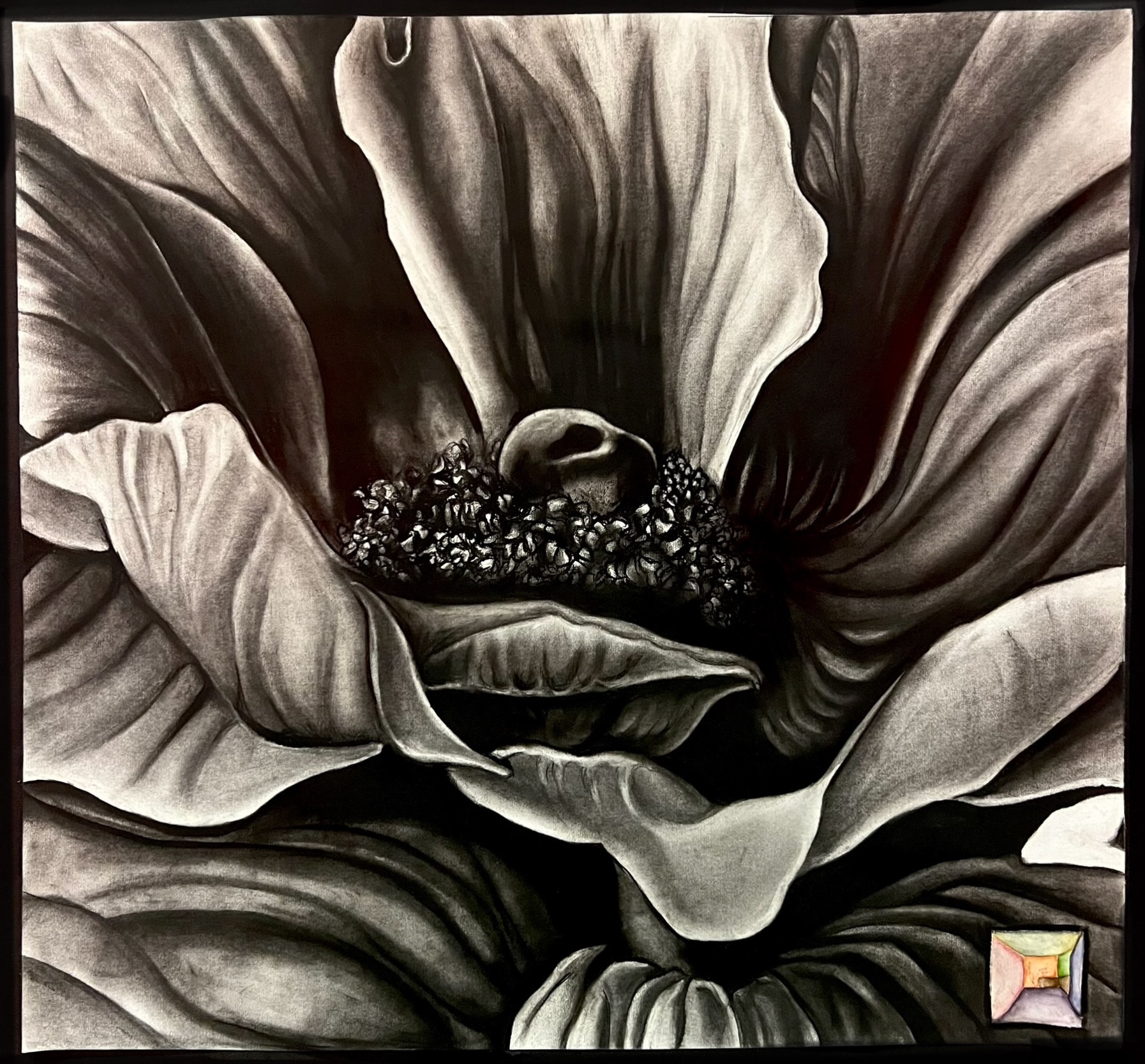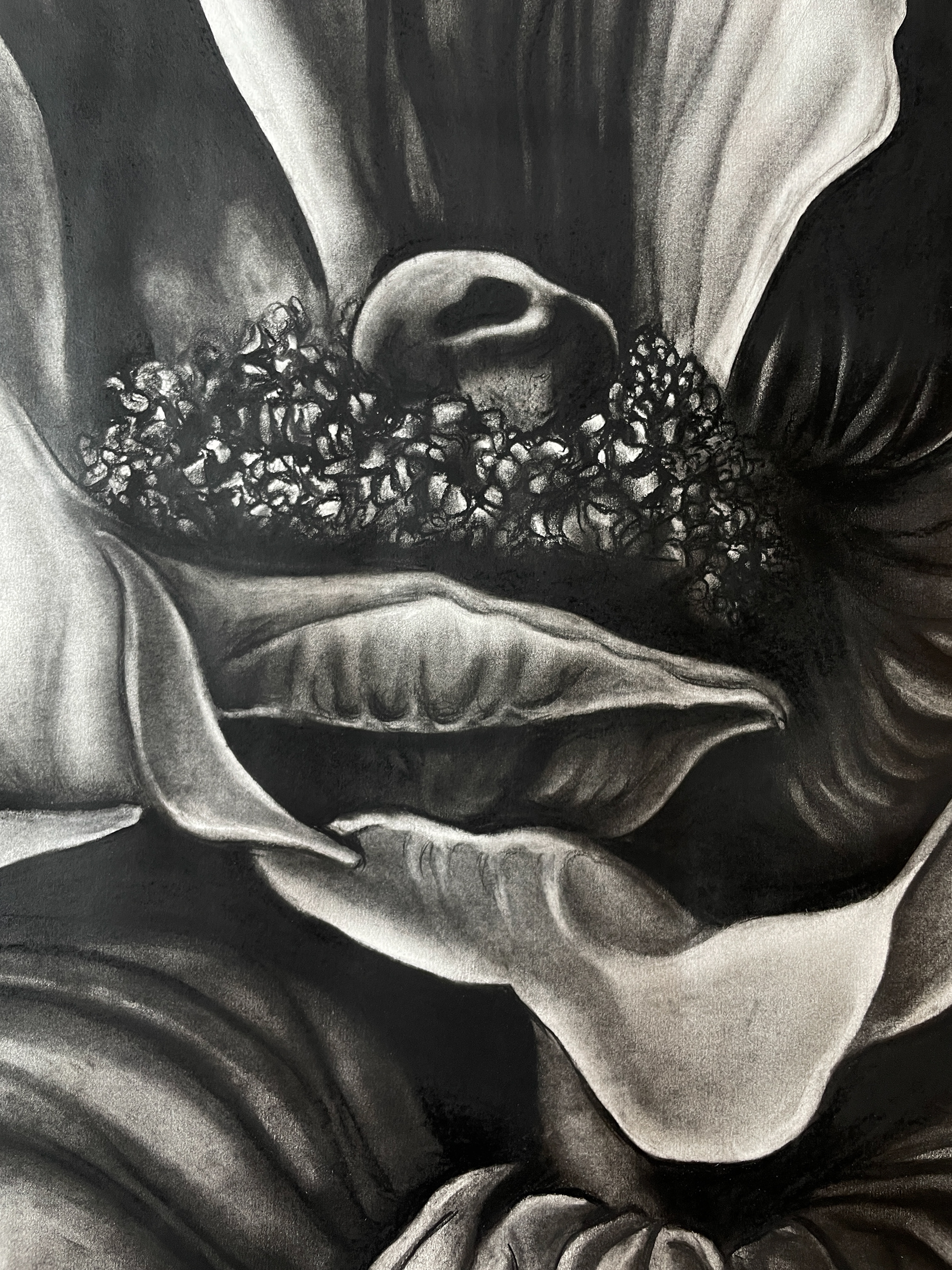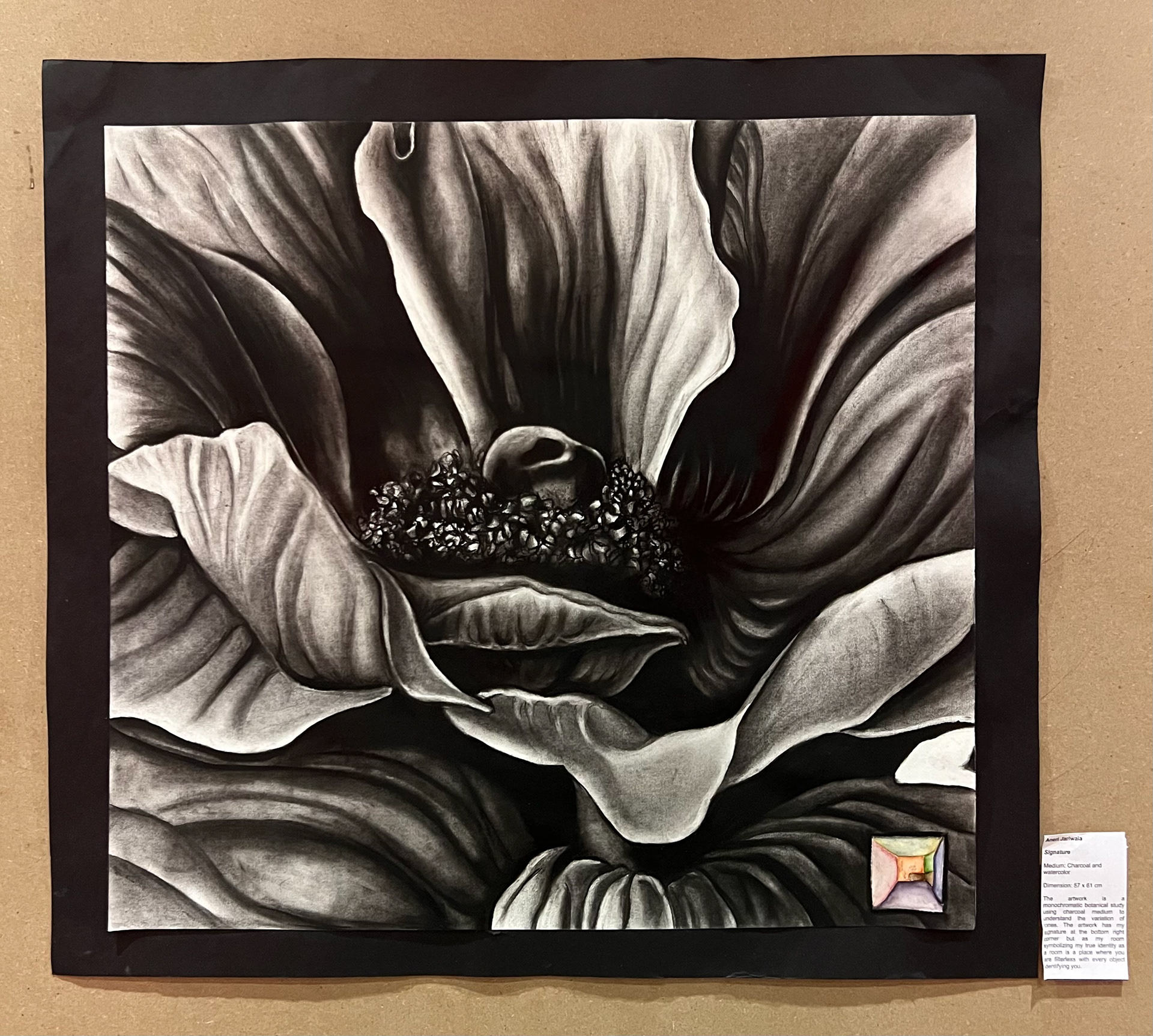 The artwork is a monochromatic botanical study using charcoal medium to understand the variation of tones. The artwork has my signature at the bottom right corner but not a traditional one rather as my room structure which symbolizes my true identity as I believe that a room is a place where you are filter-less with every object truly identifying you.
